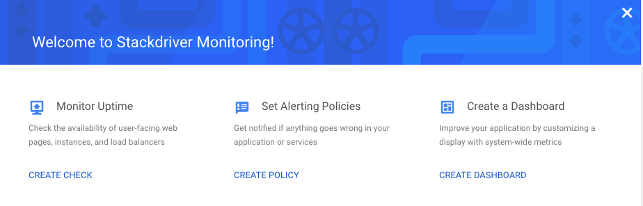Strackdriver lets you create alerting policies, uptime monitors and custom dashboards.
