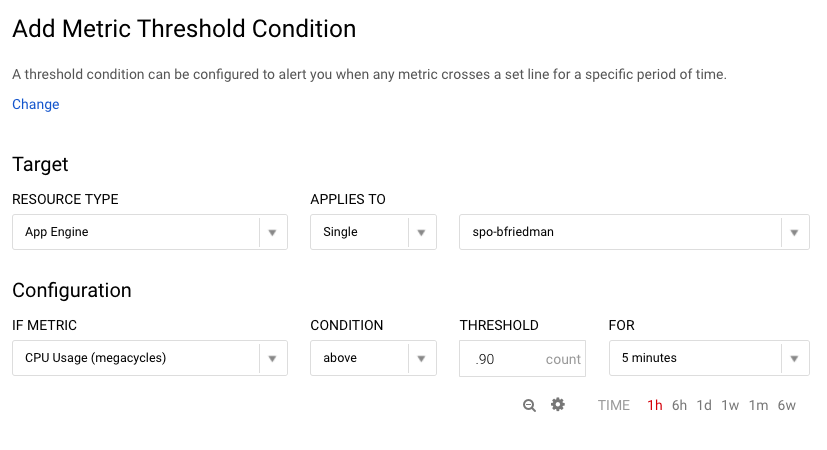 Again, I created a basic condition to alert after 5 minutes of CPU usage above 90%.